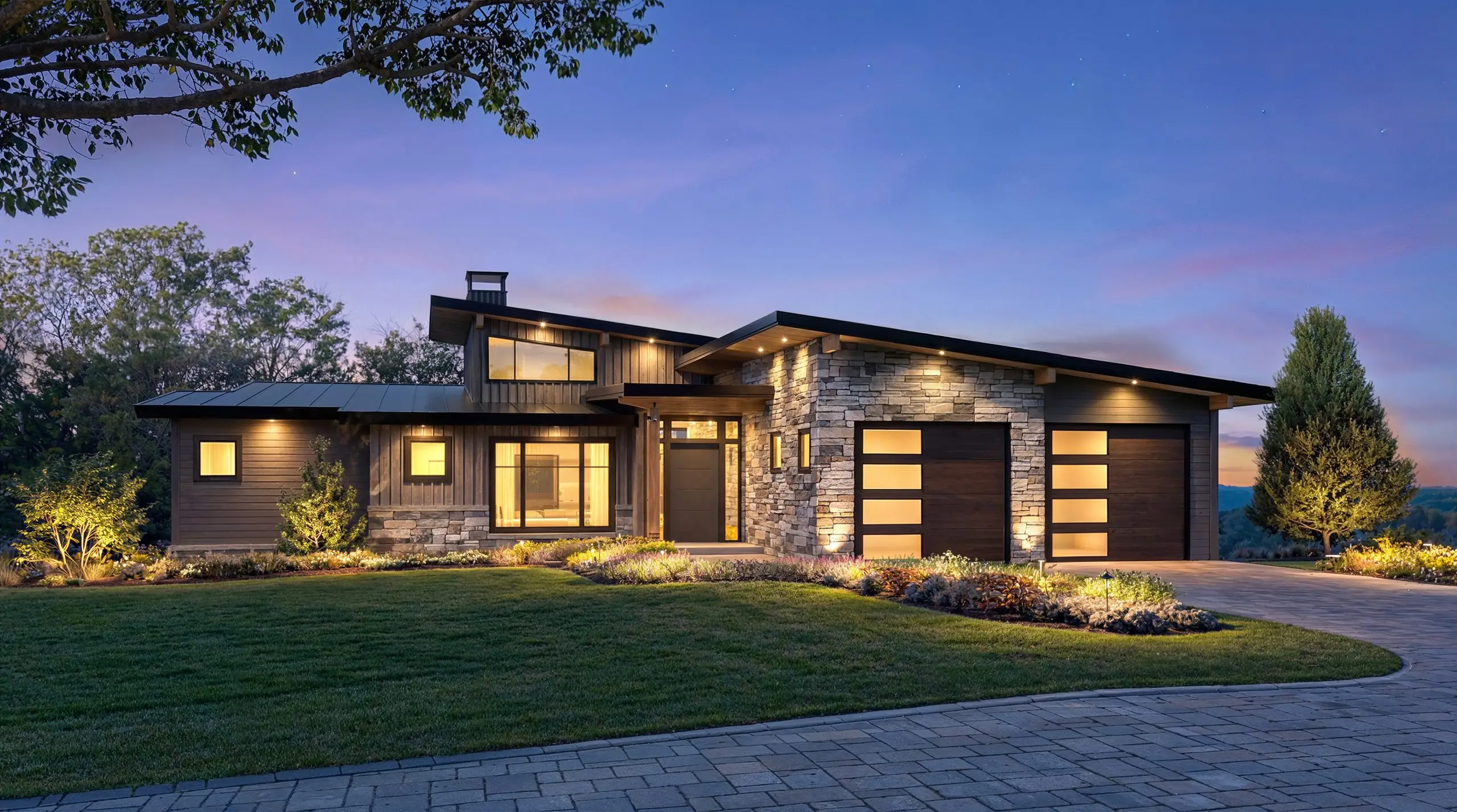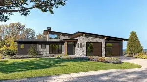 The contemporary exterior of the Archer is full of expressive roof lines and a mix of wood, metal, and stone. This organic approach ensures that this contemporary design nestles well in any natural setting.