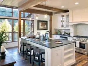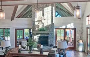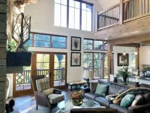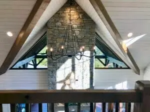 An Outdoor Living area with large timber framing and a fireplace allows for extended use in early spring and late fall and is screened for l-fresco dining and cooking, free from the insects. Upper level bedrooms are identical for so all guests feel treated equally. An upper level loft perches