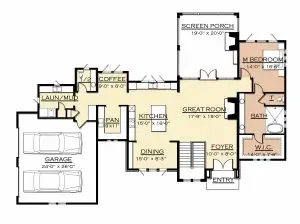 The Hampton is a refined example of transitional architecture, seamlessly blending traditional charm with contemporary sophistication. This thoughtfully designed residence features three spacious bedrooms and 3.5 elegant baths, offering both comfort and functionality. Its open floor plan creates a fluid connection between the vaulted-ceiling great room, gourmet kitchen, and cozy den, ideal for both entertaining and everyday living. The soaring ceilings and expansive windows invite natural light, enhancing the sense of space and warmth throughout.