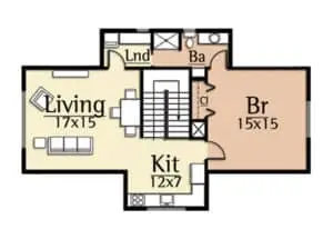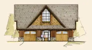More than just a garage, the Oak Carriage House combines automobile storage and living into one compact design. The Oak features 1 bedroom and 1 bath, and a 2 car garage. A large Living area with exposed timbers and a open Kitchen complete a dramatic interior. Exterior timber, stone, board and batten, and shingle detailing complete the feel of this perfect rustic getaway.