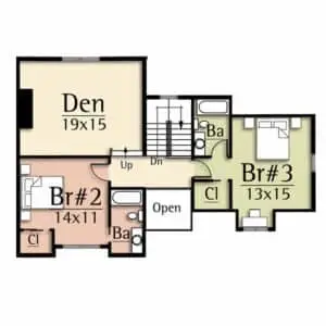 The upper level features two spacious guest rooms with baths, and a large den for family activities.
