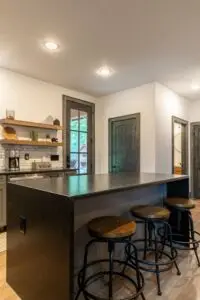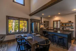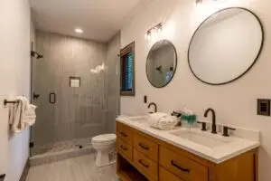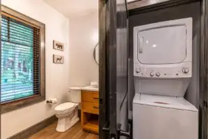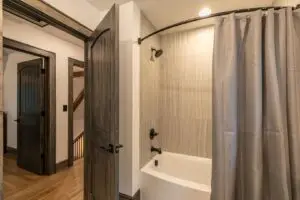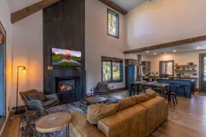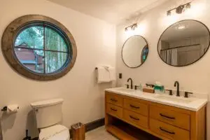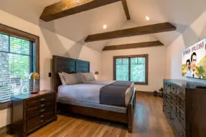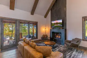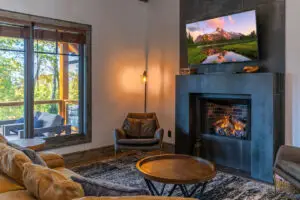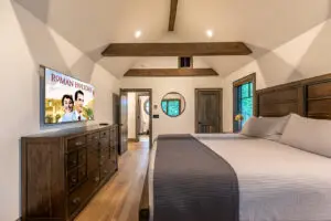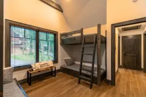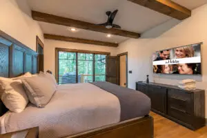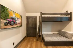 Upstairs are two bedrooms with a shared full bath in the hallway, featuring a premium tiled shower and ample space for guests to prepare for the day. To the right is a large, second king bedroom with stunning views of the mountain, and to the left, two sets of twin-over-twin bunk beds and plenty of room to relax or enjoy some of the games available for guests. All 3 bedrooms have smart TV’s mounted on the wall.