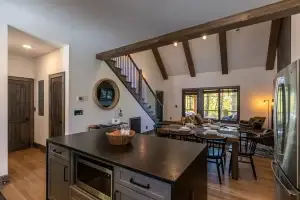 Enter to the open-concept main level, with a spacious dining table and seating for eight guests. The modern and well-equipped kitchen provides plenty of space to prepare your meals, and features granite counters, full island and stainless-steel appliances. A half bath is conveniently located just down the hall, along with a full-sized washer and dryer and ample storage. The large cathedral ceilings open the space up to the gas log fireplace, along with a Smart TV and Roku capabilities, which extend to all 4 TVs in the house. A cozy selection of comfortable seating looks out onto uninterrupted mountain views. A spacious king suite is on the main level with views over the expansive deck and mountainside, and a large private bath with walk-in glass wall shower and double vanity.