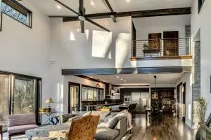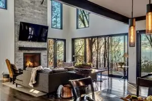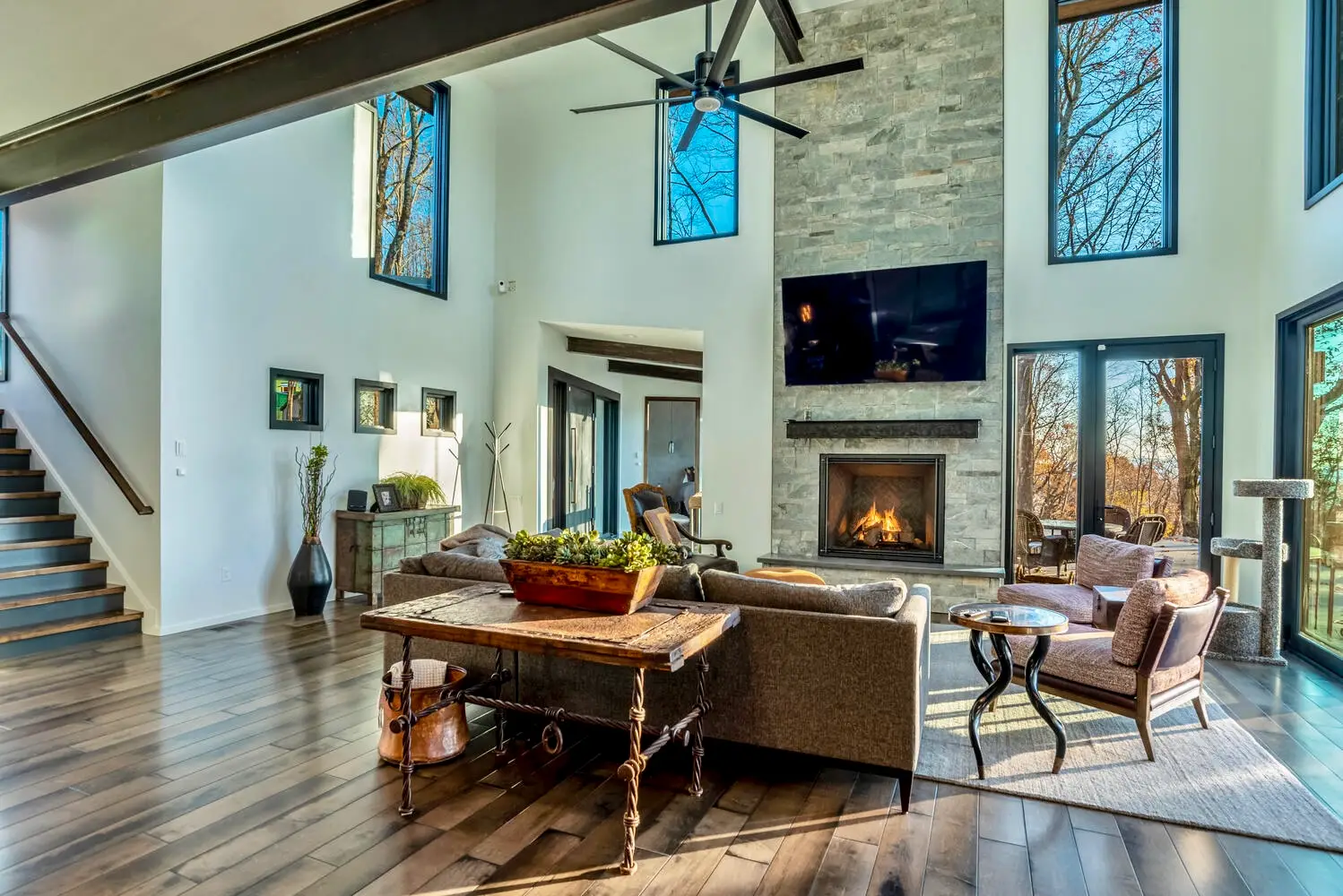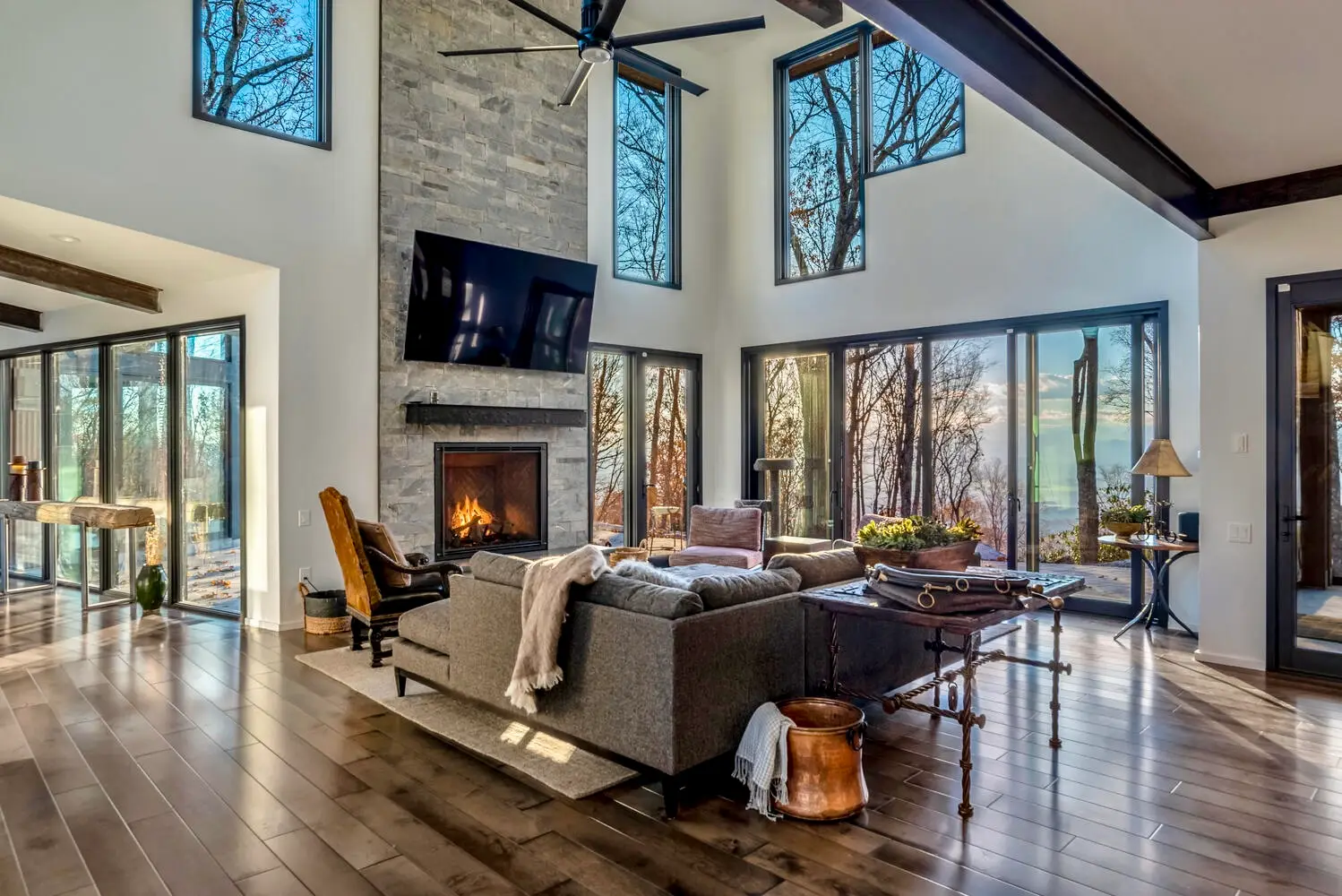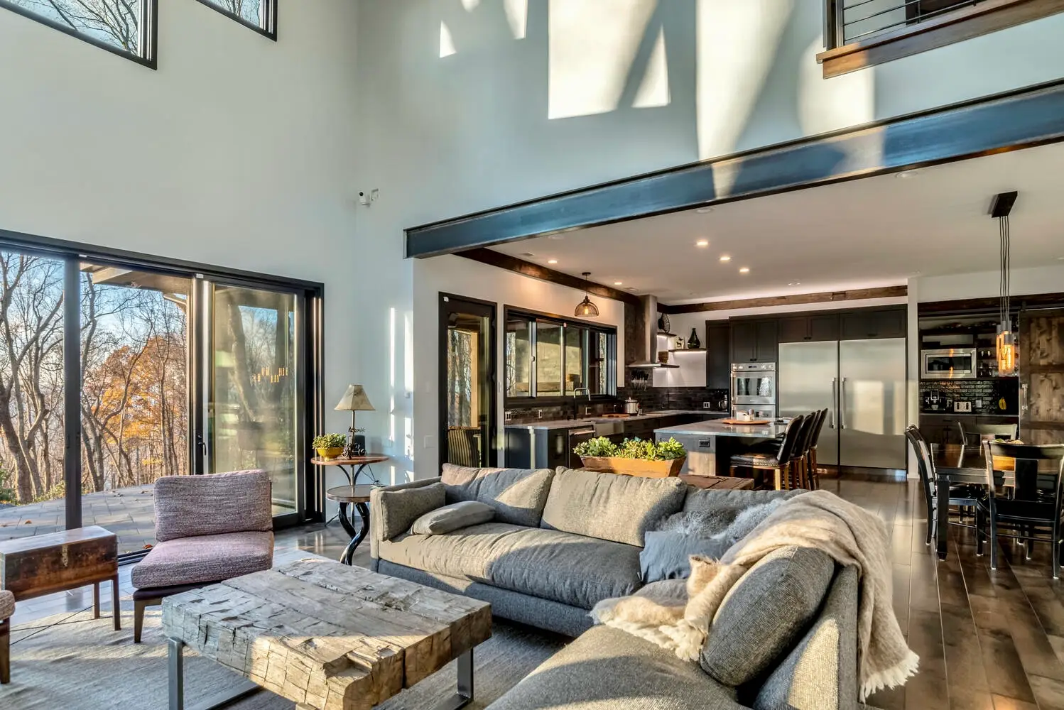 From the moment you enter, the great room captivates with soaring ceilings and expansive glass walls that dissolve the boundary between indoors and out, immersing you in the lush forest canopy. The open-concept layout flows effortlessly from the chef’s kitchen—equipped with sleek, modern finishes—into the dining and living areas, creating an ideal setting for both intimate gatherings and grand entertaining.