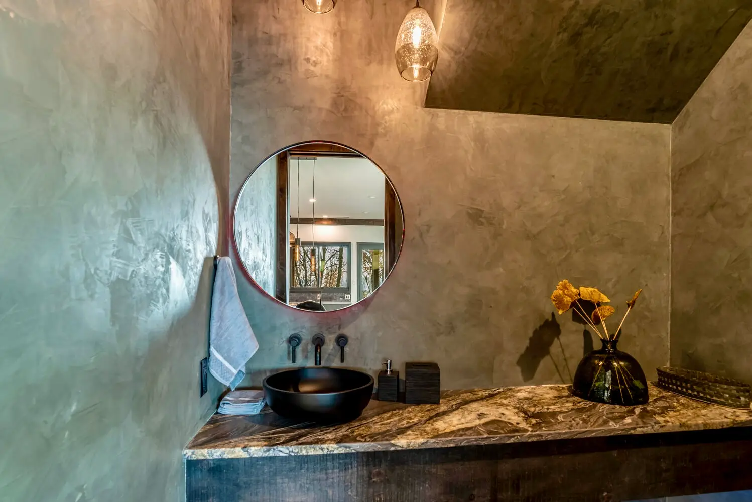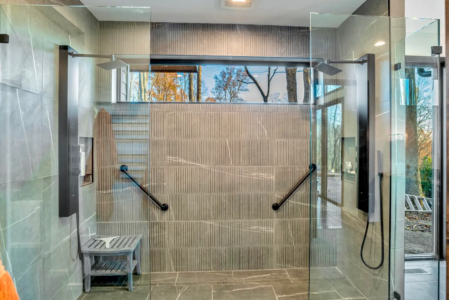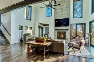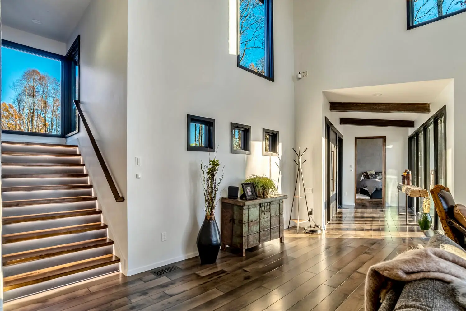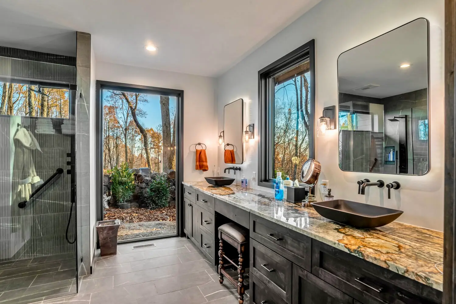 From the moment you enter, the great room captivates with soaring ceilings and expansive glass walls that dissolve the boundary between indoors and out, immersing you in the lush forest canopy. The open-concept layout flows effortlessly from the chef’s kitchen—equipped with sleek, modern finishes—into the dining and living areas, creating an ideal setting for both intimate gatherings and grand entertaining.
