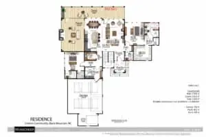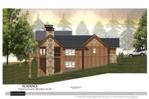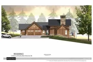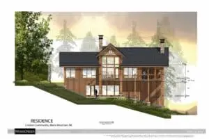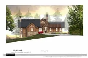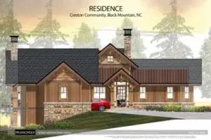 This beautiful home for a couple from Orlando will be built in the Creston Community of Black Mountain. The house sits on a lot who’s slope is perpendicular to the view. This required some clever thinking, but as you can see, we made it happen. The house is a hybrid timber frame that features the classic MossCreek mixed materials palette of stone, board and batten, band board friezes, cedar shingle siding, timber accents with metal strapping, and shingle and metal roofing.