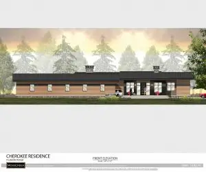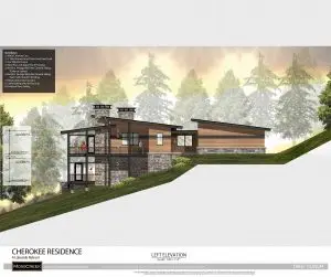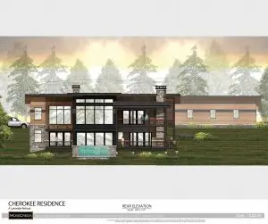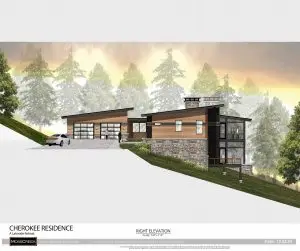This new home design epitomizes modern mountain style, blending natural elements with contemporary aesthetics. The exterior is a harmonious mix of stone, wood, and metal, creating a sleek yet rustic look that fits perfectly into a mountainous landscape. The neatly tailored materials give the home a polished and sophisticated appearance.