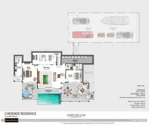 This level also includes a garage designed to house an exotic car collection, catering to automotive enthusiasts.