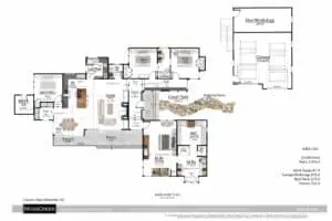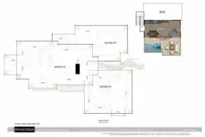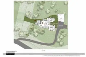 The house features minimalist detailing and floor to ceiling windows to create a contemporary ranch style home. The design contains open plan living for the public spaces, and four bedrooms with nice separation between the primary suite and the guest bedrooms. The detached garage has a delightful roof garden complete with pool.